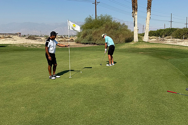 Adrian Leon tends the flag while Roy Mixer putts for par on 12.